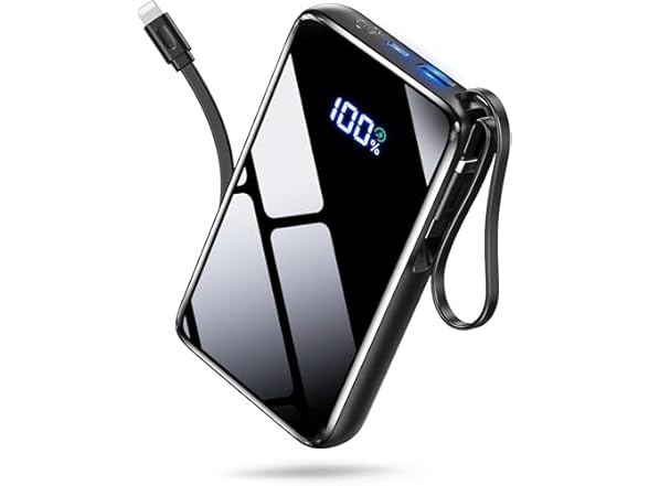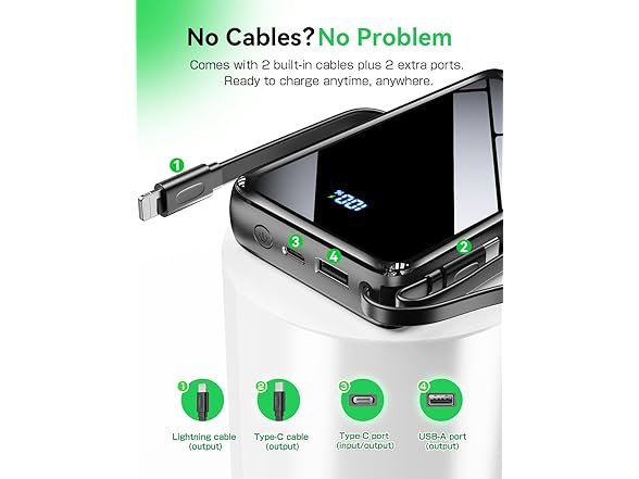 - Built-in Cables + Dual Ports & All-in-One Cable-Free Charging Solution No more cable clutter! This power bank features two integrated cables: a Type-C cable for Android phones/tablets and a Lightning cable for iPhones. Simply pull out and plug in. Combined with the additional Type-C (input/output) and USB-A output ports, you can juice up four devices simultaneously. Cables tuck neatly inside when not in use—tangle-free and travel-ready for true grab-and-go convenience.