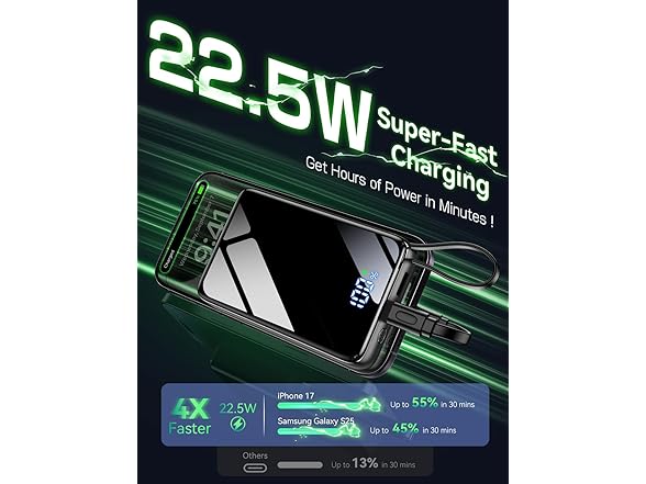 - 22.5W Ultra-Fast Charging & Multi-Protocol Support for iPhone, Android & Huawei Experience rapid power delivery with 22.5W max output, engineered for quick top-ups during busy mornings or on-the-go use. Compatible with PD (iPhone/iPad), QC (Xiaomi/Samsung), and SCP (Huawei) fast-charging protocols. A clear digital display shows remaining battery from 0–100%, and a dedicated “Fast Charge” indicator lights up when high-speed charging is active—so you always know your power status.