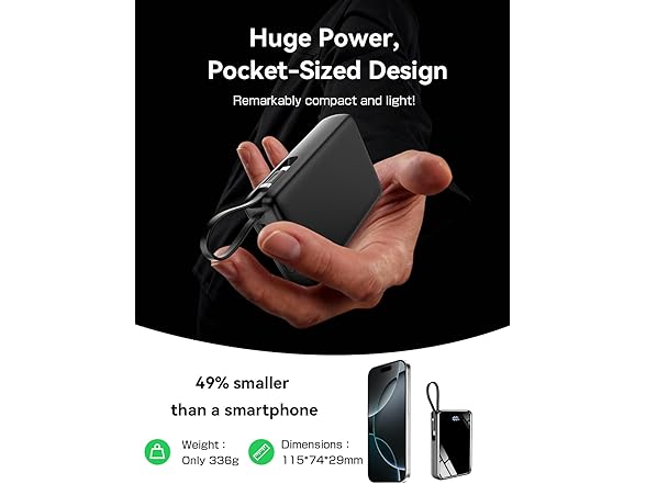 - Compact & Portable with Low-Current Mode & Pocket-Friendly for Everyday Carry Despite its huge capacity, it’s designed for portability—measuring just 115 x 74 x 29 mm and weighing ~336g. Fits easily in backpacks, handbags, or jacket pockets. Hold the power button for 2 seconds to switch to Low-Current Mode, perfect for safely charging wireless earbuds, smartwatches, or other low-power gadgets. Your ideal companion for travel, work, and daily commutes.