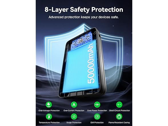 - Advanced 8-Layer Safety Protection & Safe Charging for You & Your Devices Engineered with robust safety technology, this power bank includes 8-layer protection: over-current, over-voltage, short-circuit, over-charge, over-discharge, overload, and over-temperature safeguards. Each charge is monitored to prevent damage to your devices and the power bank itself, giving you worry-free charging anywhere, anytime.